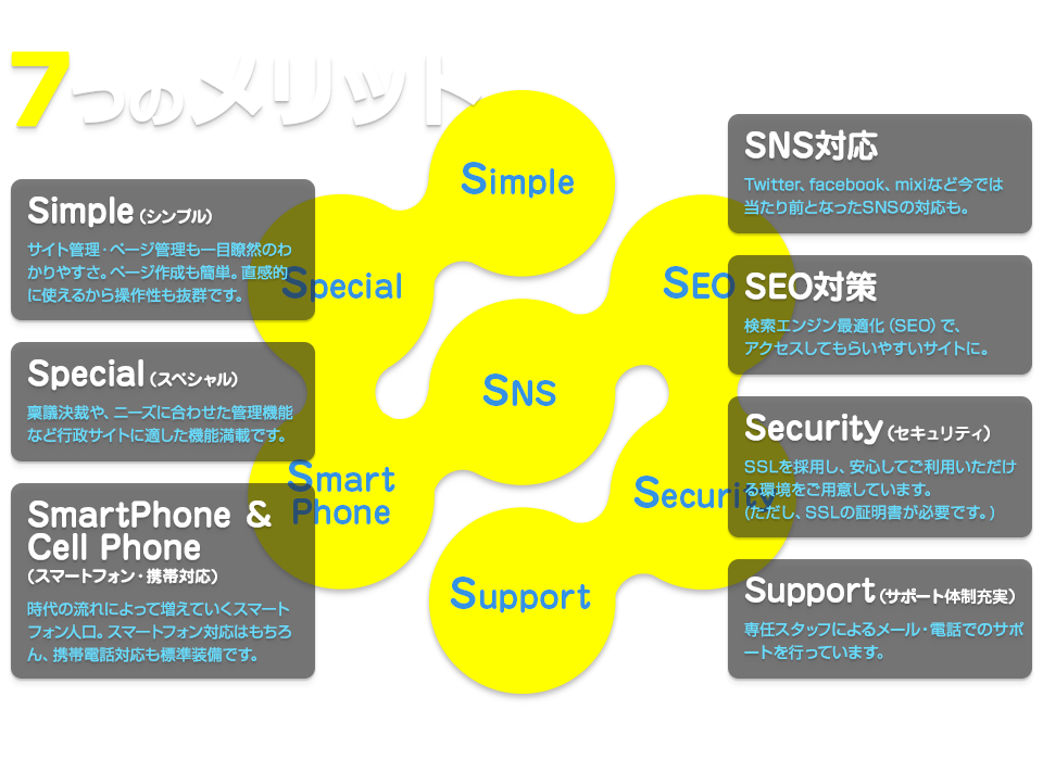 稟議決裁や、ニーズに合わせた管理機能など行政サイトに適した機能満載です。